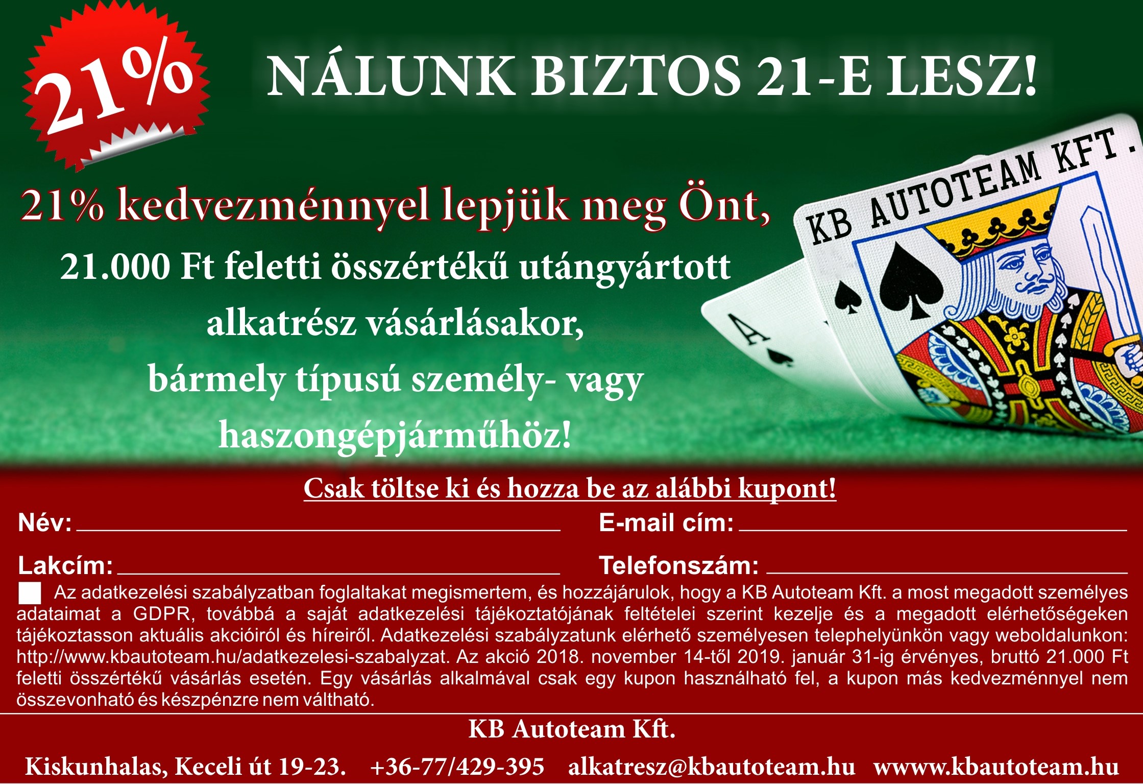 Nyomtassa ki vagy mutassa be telefonján a lent mellékelt kupont, így 21% kedvezménnyel lepjük meg Önt! A kedvezmény bármely típusú személy- vagy haszongépjárműhöz tartozó utángyártott alkatrészre érvényes 21.000 Ft feletti összértékű vásárlás esetén, érdemes beidőzíteni a régóta halogatott alkatrészek megvásárlását! :)