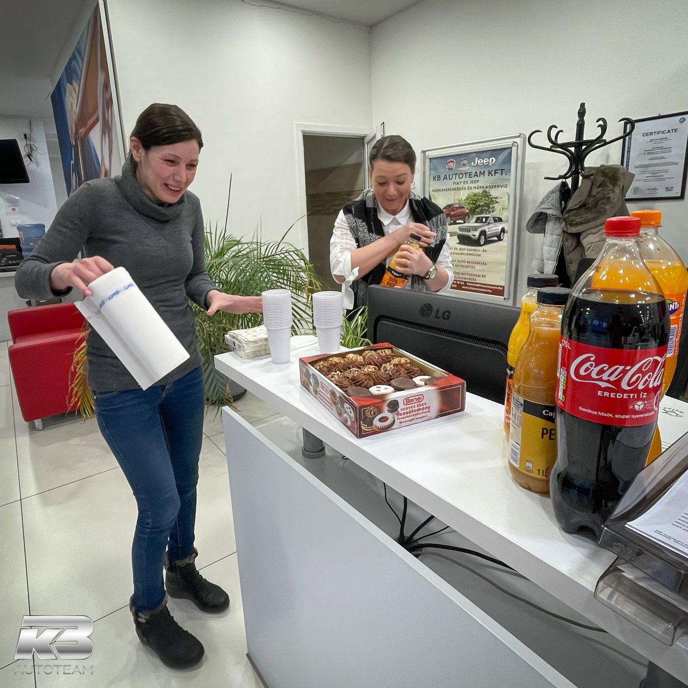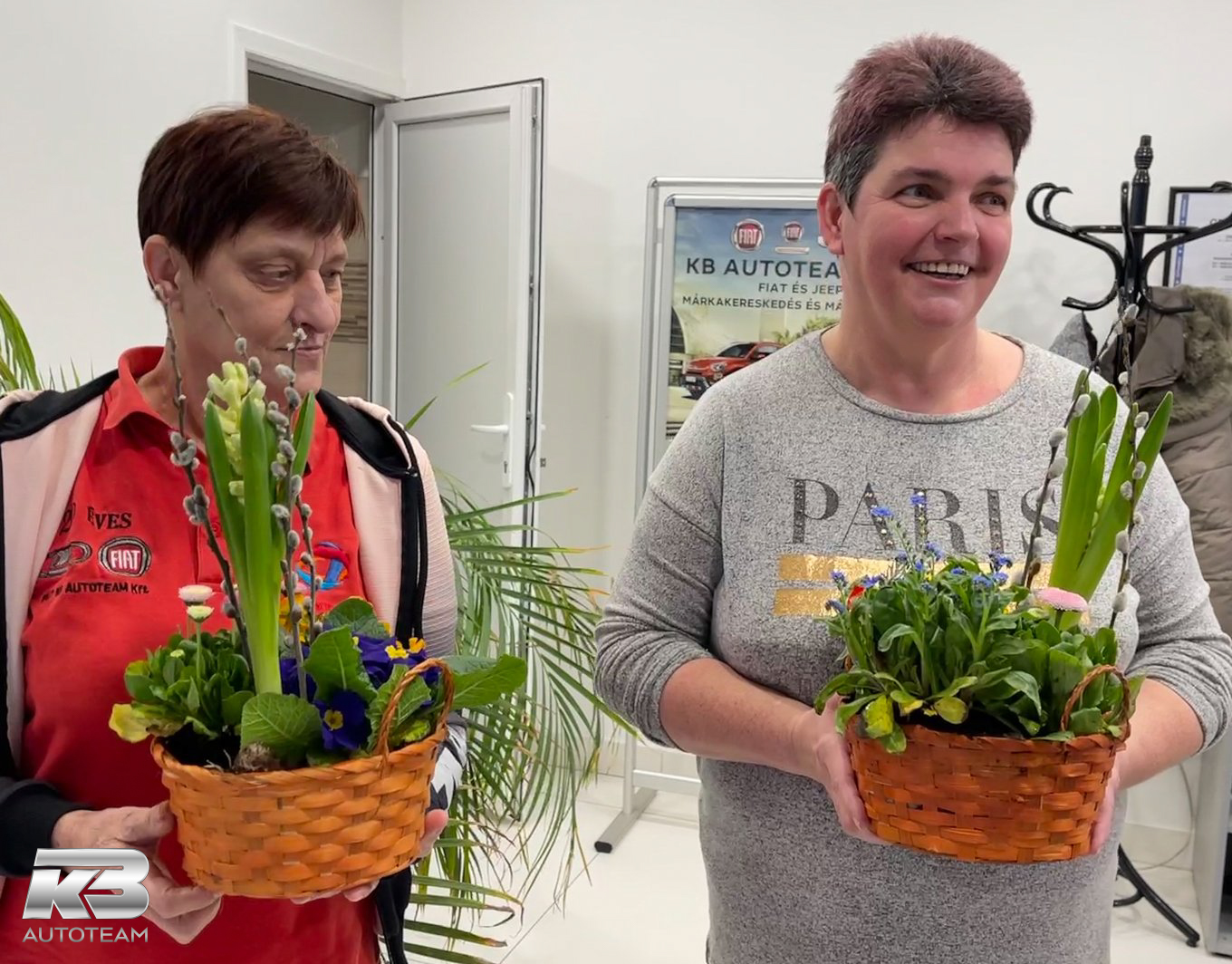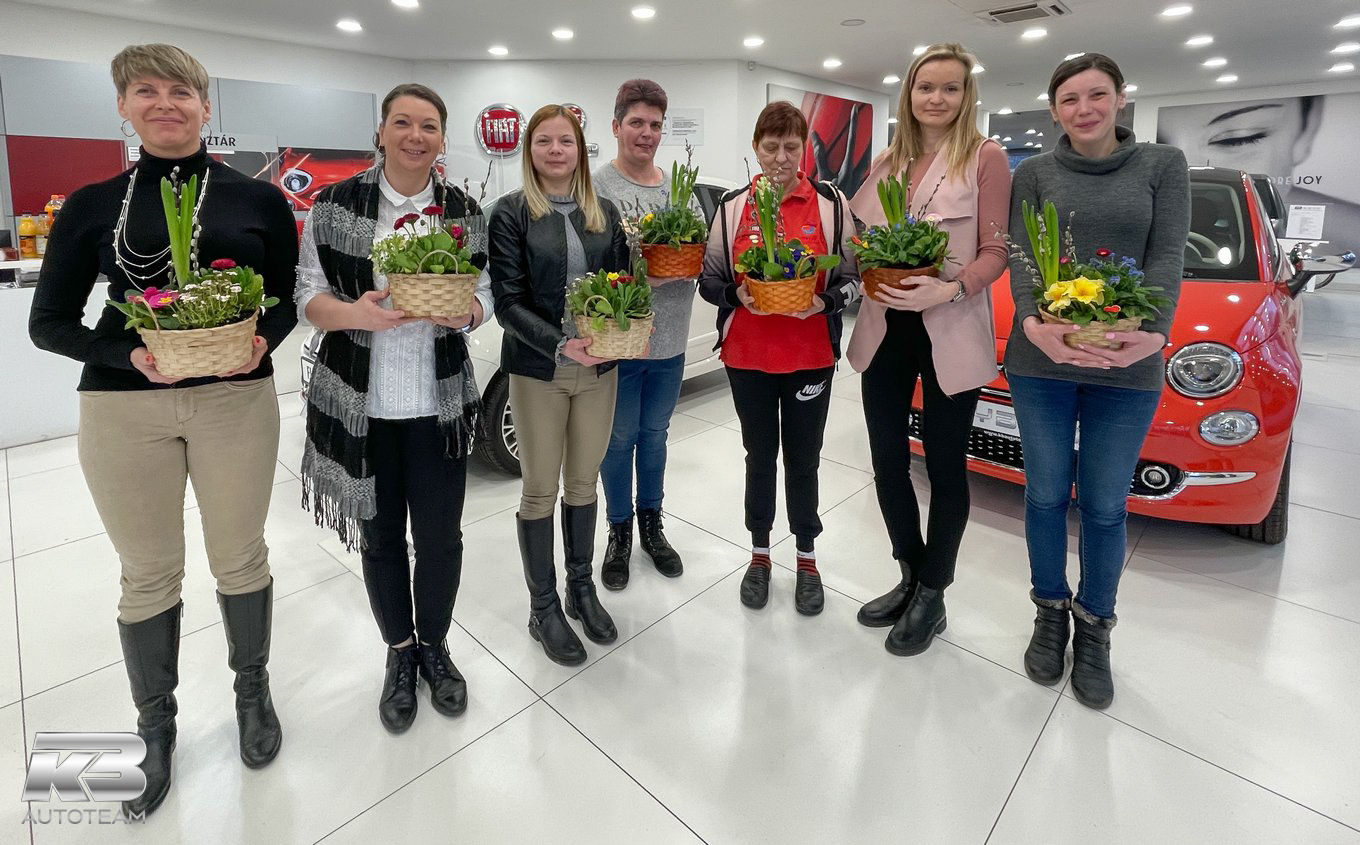 Március 8-án, a munkakezdés időszakában bensőséges keretek között köszöntötte fel nőnap alkalmából a KB Autoteam férfi közössége a társaságunknál dolgozó hölgy munkatársakat. Juhász Tibor ügyvezető vezetésével kedves és elismerő szavak kíséretében egy-egy csokor virágot kaptak hölgyeink, akik süteménnyel és üdítővel viszonozták a figyelmességet.