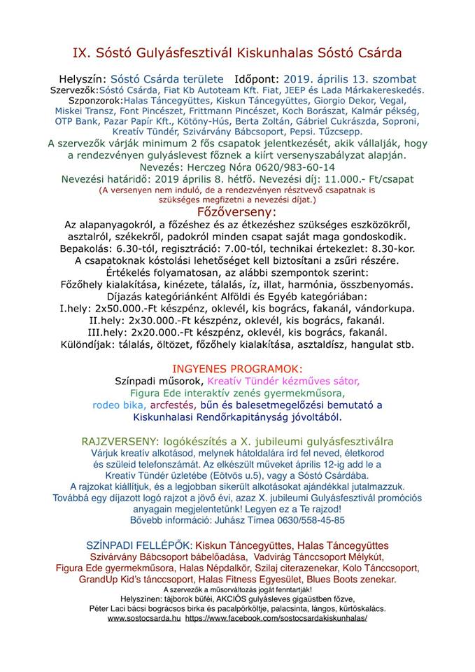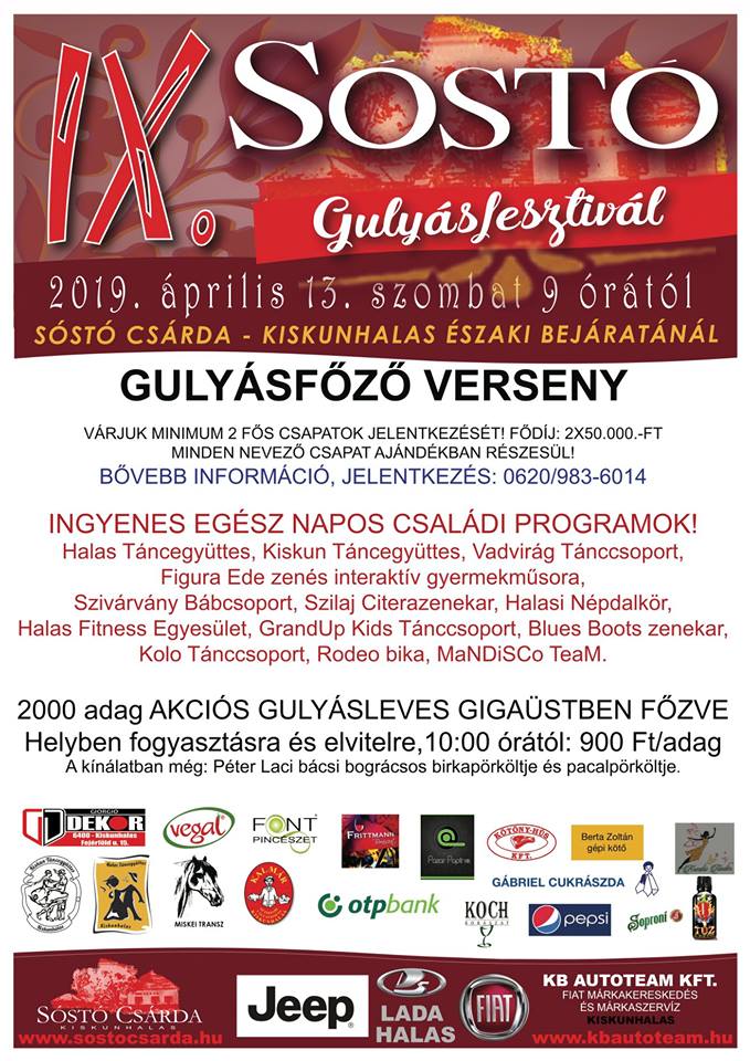 Idén kilencedik alkalommal, 2019. április 13-án szombaton 9 órától várjuk Önöket a Sóstó Gulyásfesztiválra a Sóstó Csárda és a KB Autoteam Kft. szervezésében, ahol a programokon felül megismerkedhetnek kiállításra kerülő járműveinkkel is.