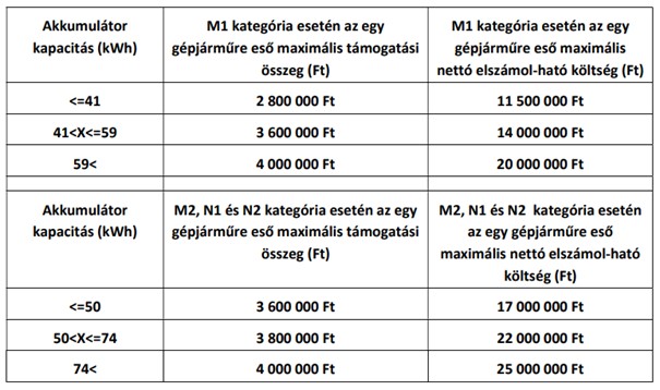 A projekt keretében beszerzett egy gépjármű maximális támogatása nem haladhatja meg az alábbi táblázatban feltüntetett, az egyes gépjármű kategóriák bruttó akkumulátor kapacitására vetített értékeket. Az egyes kategóriák esetében egy gépjármű nettó vételára nem haladhatja meg a táblázatban meghatározott maximális nettó elszámolható költség értékeket.